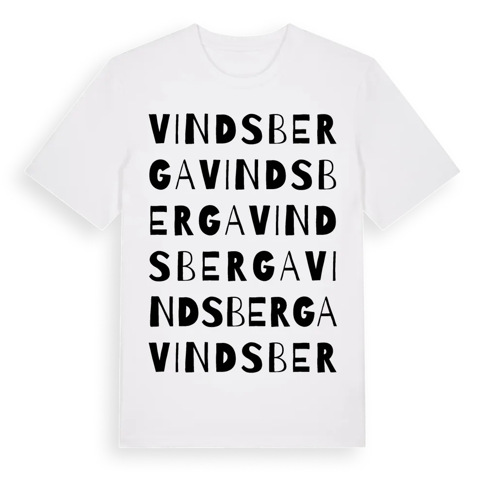Vindsberga ordlek t-shirt är inspirerad av byn Vindsberga i Uppsala län, Sverige. Tröjan är designad för dig som har en speciell koppling till platsen – oavsett om du bor här, har rötterna här eller bara älskar Vindsberga.