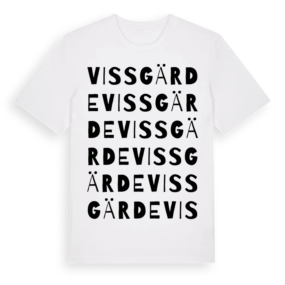 Vissgärde ordlek t-shirt är inspirerad av byn Vissgärde i Uppsala län, Sverige. Tröjan är designad för dig som har en speciell koppling till platsen – oavsett om du bor här, har rötterna här eller bara älskar Vissgärde.