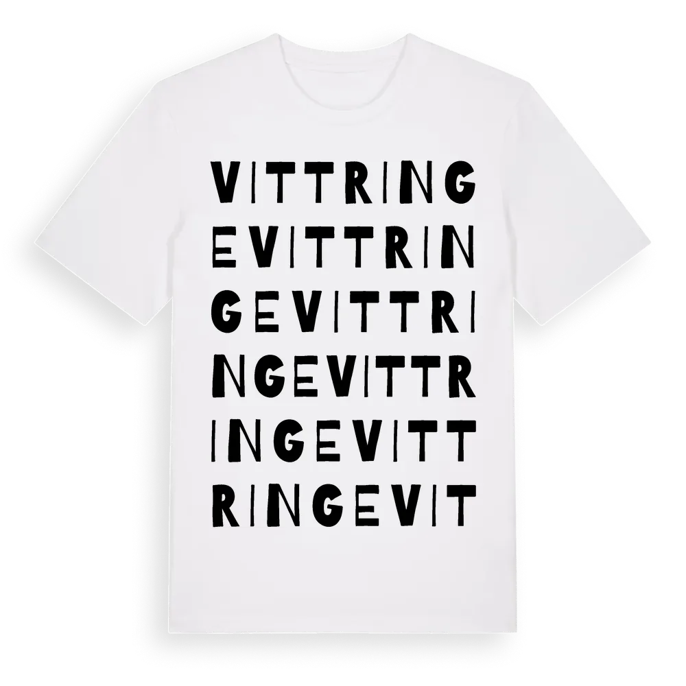 Vittringe ordlek t-shirt är inspirerad av Vittringe i Uppsala län, Sverige. Tröjan är designad för dig som har en speciell koppling till platsen – oavsett om du bor här, har rötterna här eller bara älskar Vittringe.
