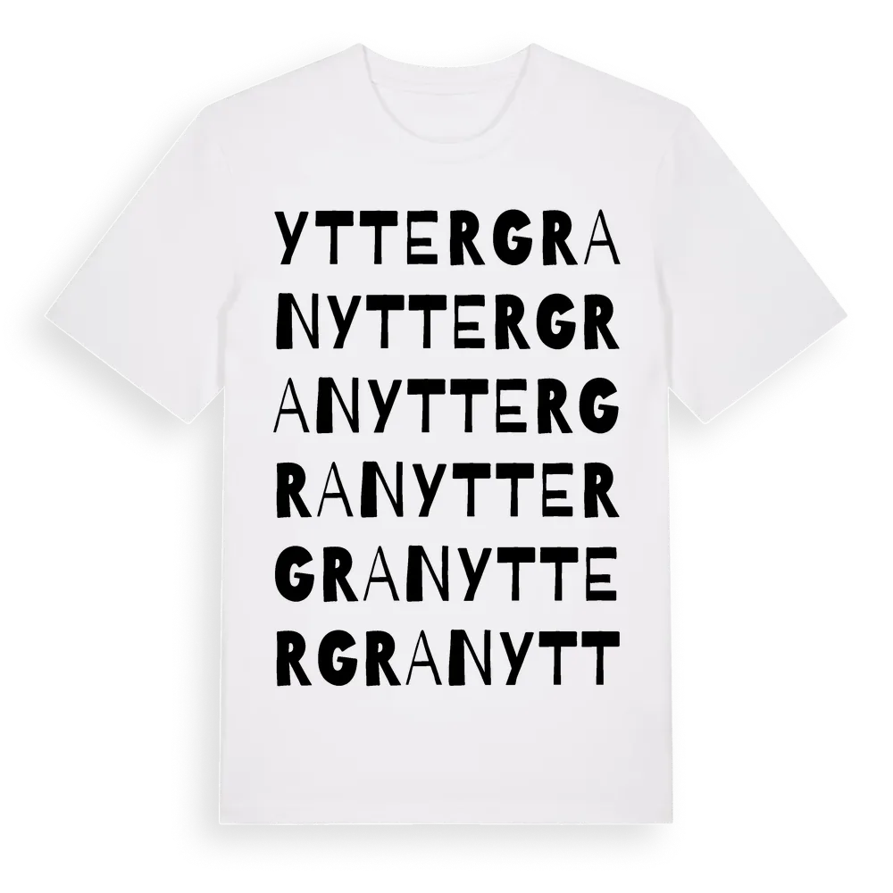 Yttergran ordlek t-shirt är inspirerad av byn Yttergran i Uppsala län, Sverige. Tröjan är designad för dig som har en speciell koppling till platsen – oavsett om du bor här, har rötterna här eller bara älskar Yttergran.