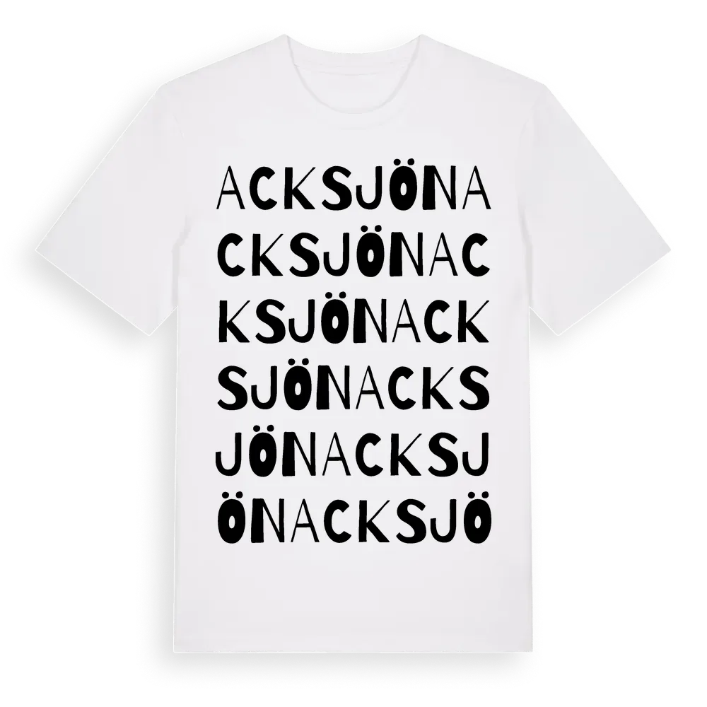 Acksjön ordlek t-shirt är inspirerad av byn Acksjön i Värmlands län, Sverige. Tröjan är designad för dig som har en speciell koppling till platsen – oavsett om du bor här, har rötterna här eller bara älskar Acksjön.