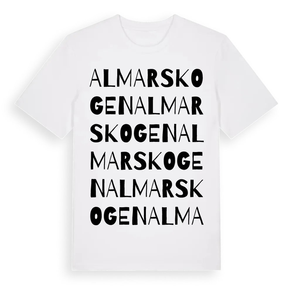 Almarskogen ordlek t-shirt är inspirerad av Almarskogen i Värmlands län, Sverige. Tröjan är designad för dig som har en speciell koppling till platsen – oavsett om du bor här, har rötterna här eller bara älskar Almarskogen.