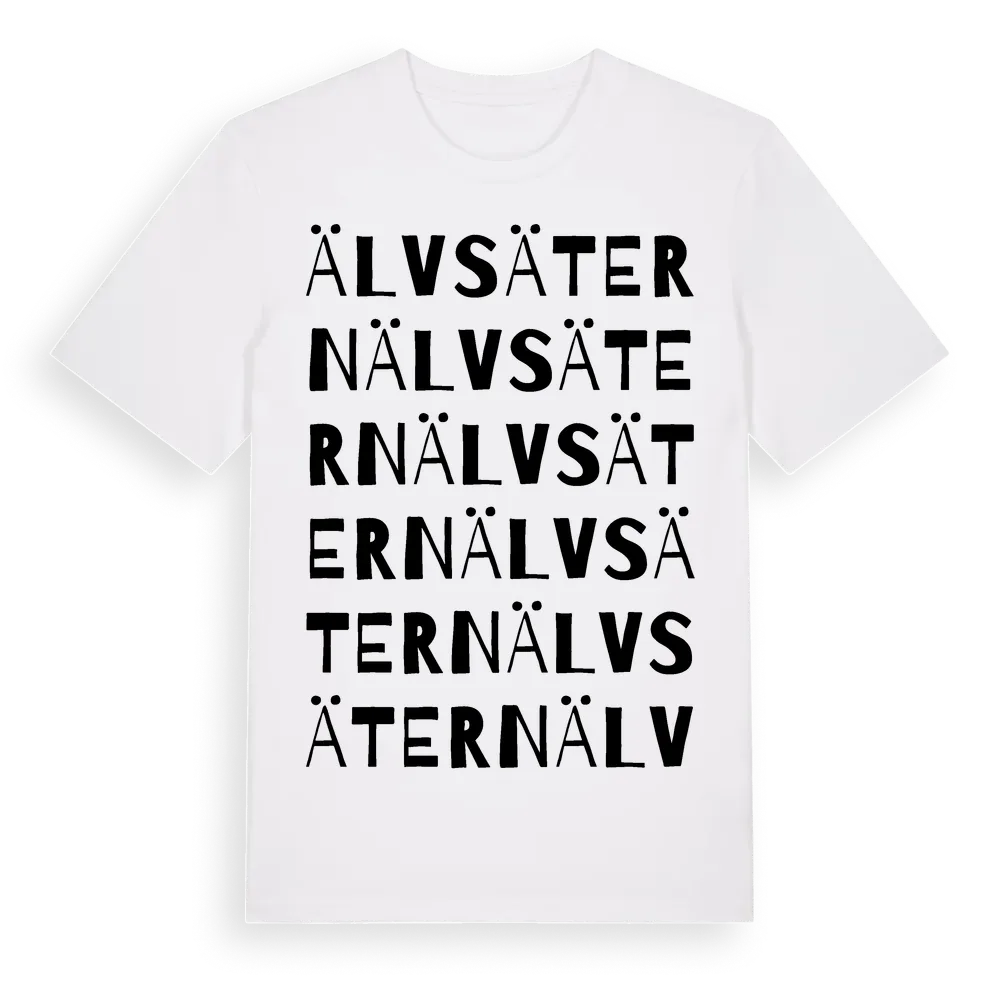 Älvsätern ordlek t-shirt är inspirerad av Älvsätern i Värmlands län, Sverige. Tröjan är designad för dig som har en speciell koppling till platsen – oavsett om du bor här, har rötterna här eller bara älskar Älvsätern.