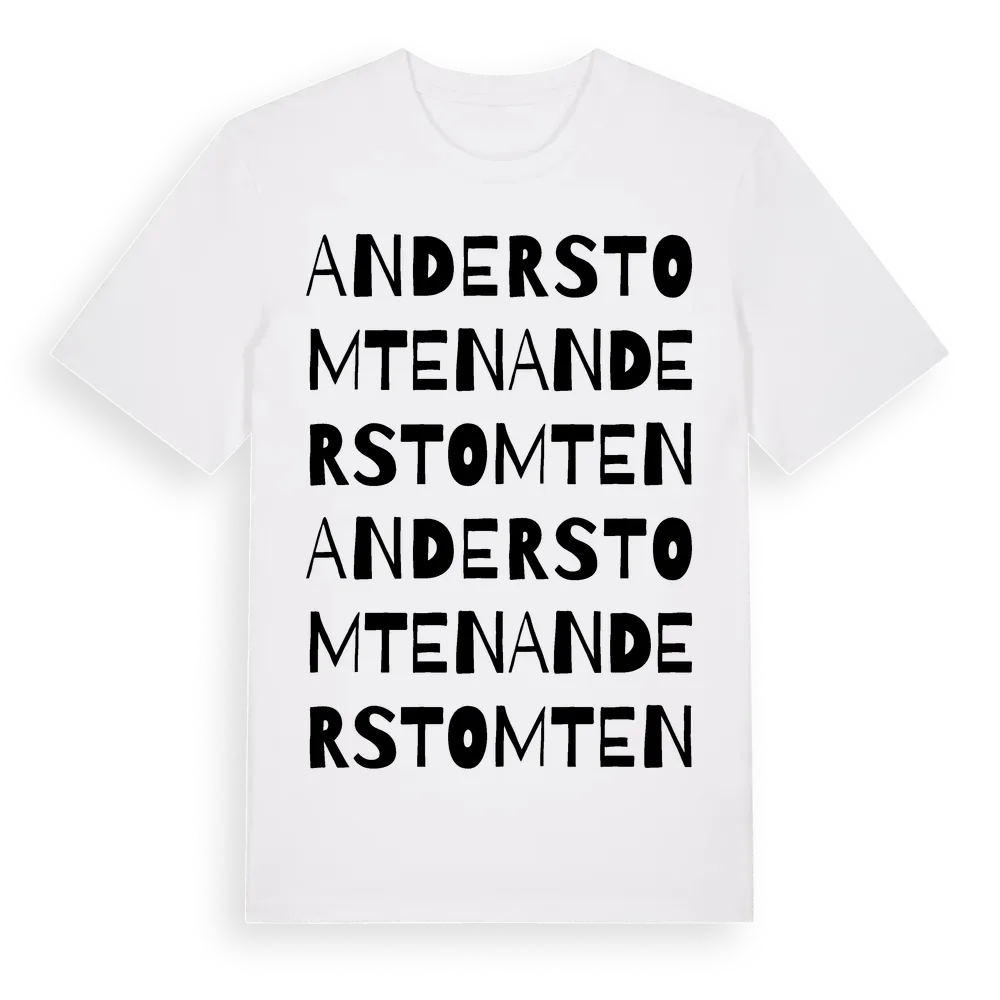 Anderstomten ordlek t-shirt är inspirerad av Anderstomten i Värmlands län, Sverige. Tröjan är designad för dig som har en speciell koppling till platsen – oavsett om du bor här, har rötterna här eller bara älskar Anderstomten.