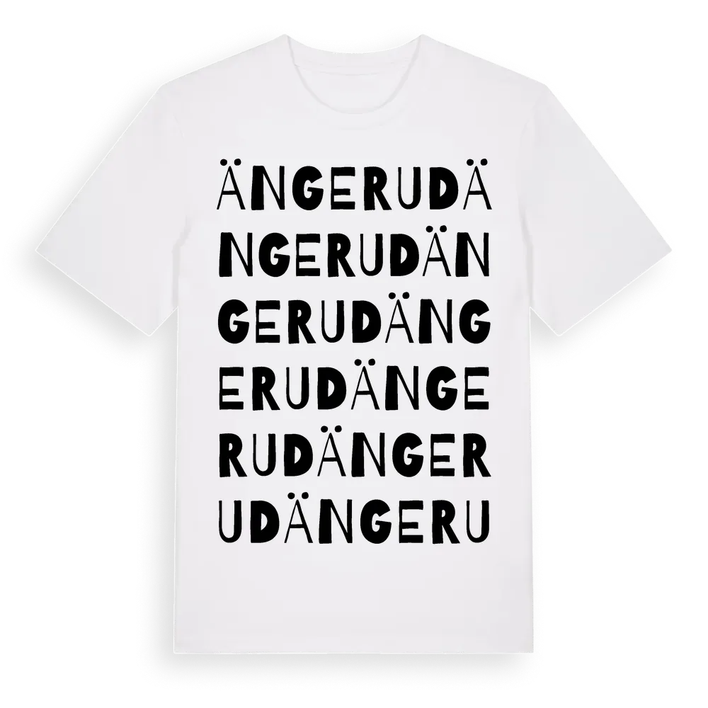 Ängerud ordlek t-shirt är inspirerad av Ängerud i Värmlands län, Sverige. Tröjan är designad för dig som har en speciell koppling till platsen – oavsett om du bor här, har rötterna här eller bara älskar Ängerud.