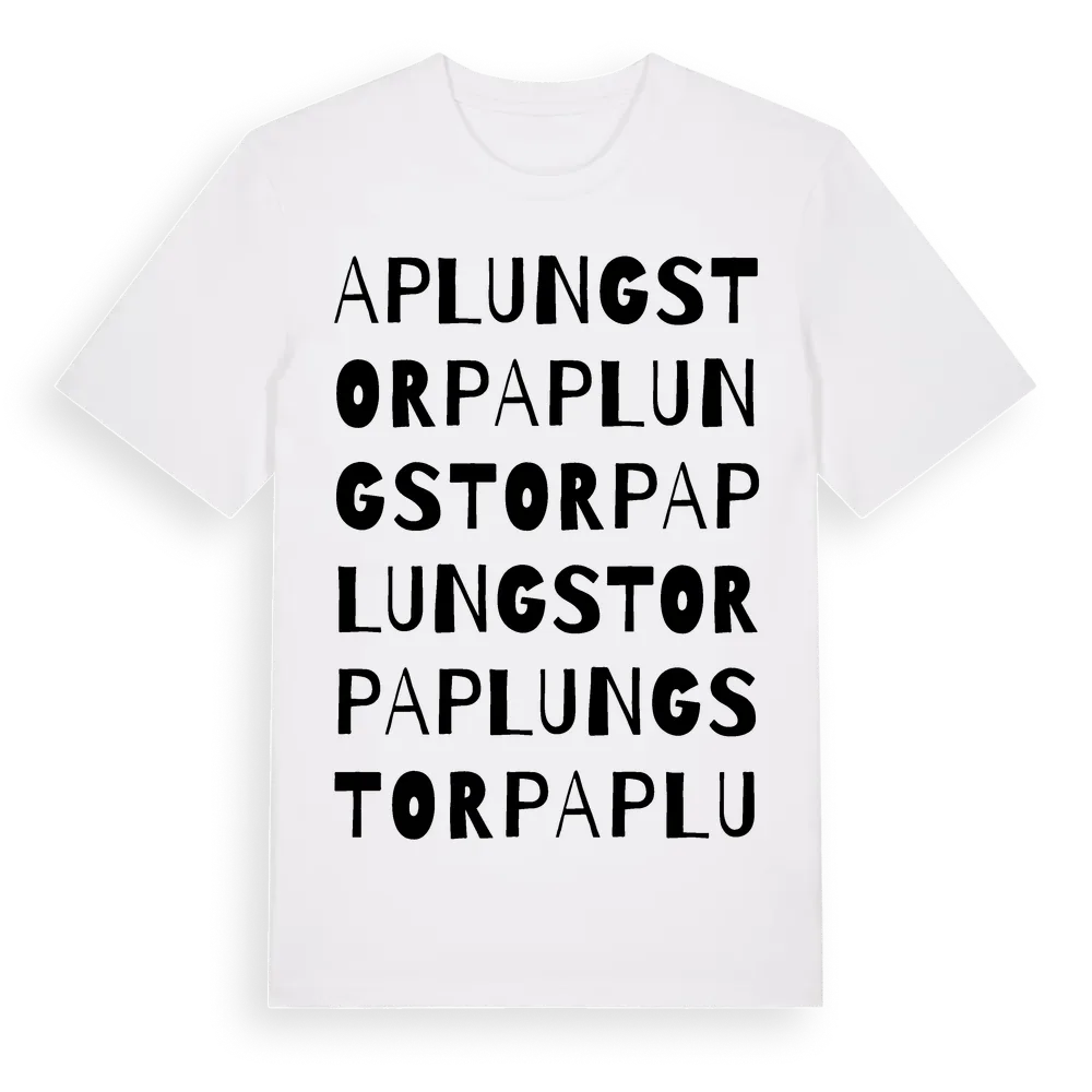 Aplungstorp ordlek t-shirt är inspirerad av Aplungstorp i Värmlands län, Sverige. Tröjan är designad för dig som har en speciell koppling till platsen – oavsett om du bor här, har rötterna här eller bara älskar Aplungstorp.