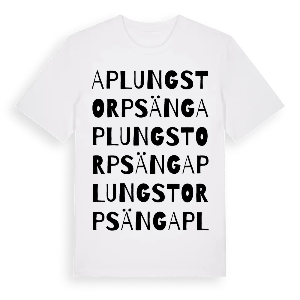 Aplungstorpsäng ordlek t-shirt är inspirerad av Aplungstorpsäng i Värmlands län, Sverige. Tröjan är designad för dig som har en speciell koppling till platsen – oavsett om du bor här, har rötterna här eller bara älskar Aplungstorpsäng.