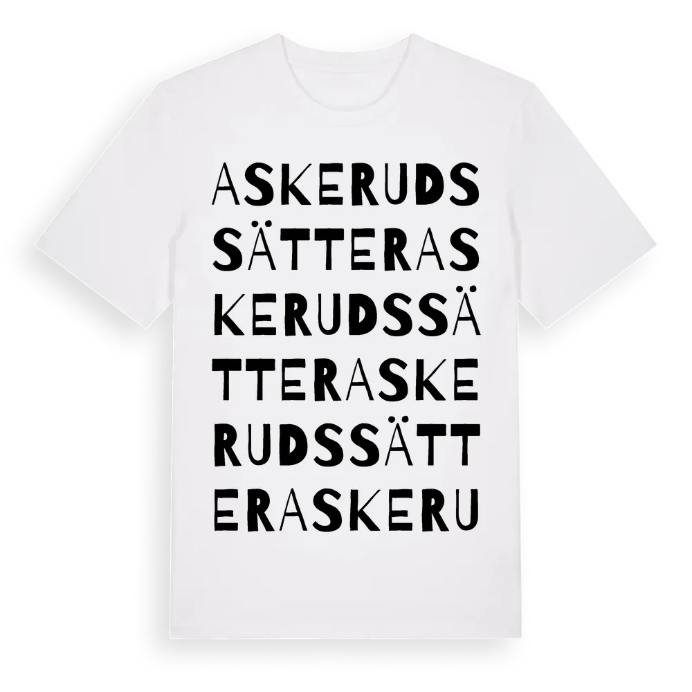 Askerudssätter ordlek t-shirt är inspirerad av byn Askerudssätter i Värmlands län, Sverige. Tröjan är designad för dig som har en speciell koppling till platsen – oavsett om du bor här, har rötterna här eller bara älskar Askerudssätter.