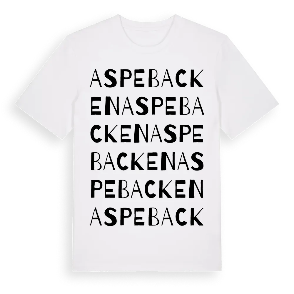 Aspebacken ordlek t-shirt är inspirerad av Aspebacken i Värmlands län, Sverige. Tröjan är designad för dig som har en speciell koppling till platsen – oavsett om du bor här, har rötterna här eller bara älskar Aspebacken.