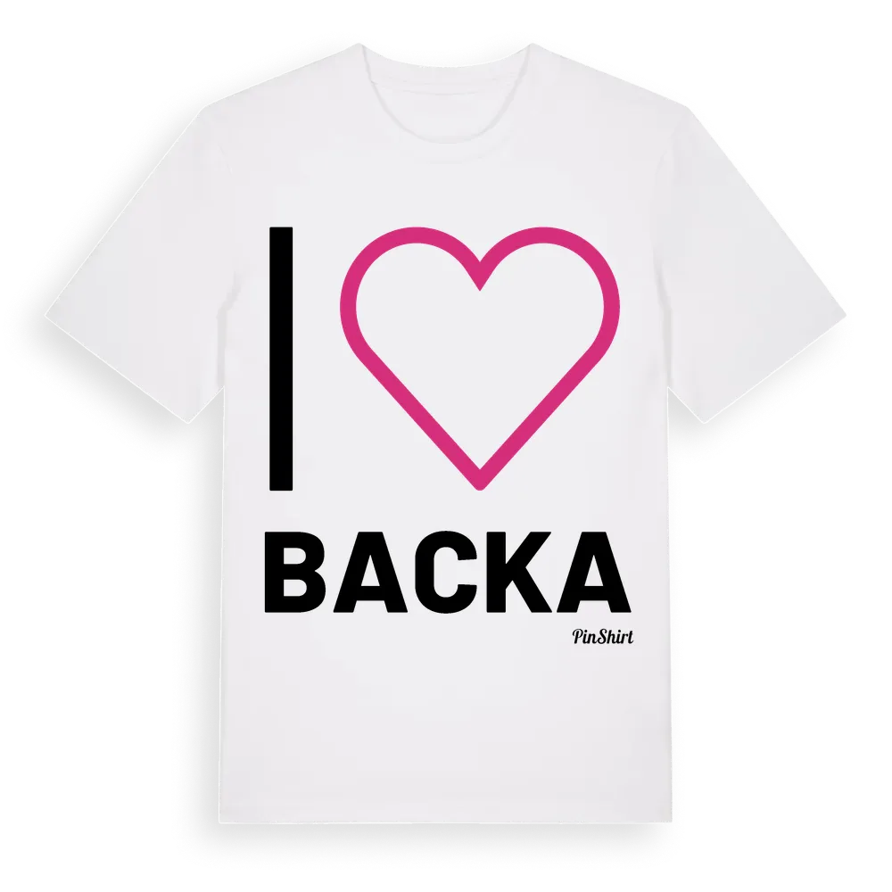Det klassiska "I ❤ Backa"-motivet i stort format som täcker hela bröstet. För dig som vill visa kärleken till Backa på riktigt. Premium bomull, unisex – från byn Backa i Värmlands län.