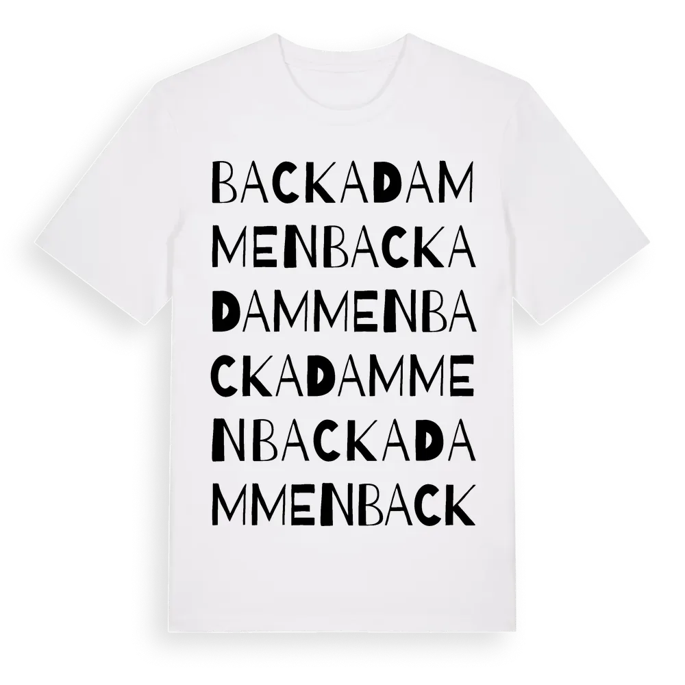 Backadammen ordlek t-shirt är inspirerad av byn Backadammen i Värmlands län, Sverige. Tröjan är designad för dig som har en speciell koppling till platsen – oavsett om du bor här, har rötterna här eller bara älskar Backadammen.