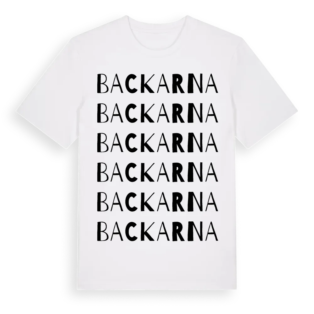 En ordlek byggd på Backarnas namn. Subtilt och klurig – ett motiv som bara de som verkligen känner platsen fullt ut förstår. Premium bomull, unisex – från Backarna i Värmlands län.