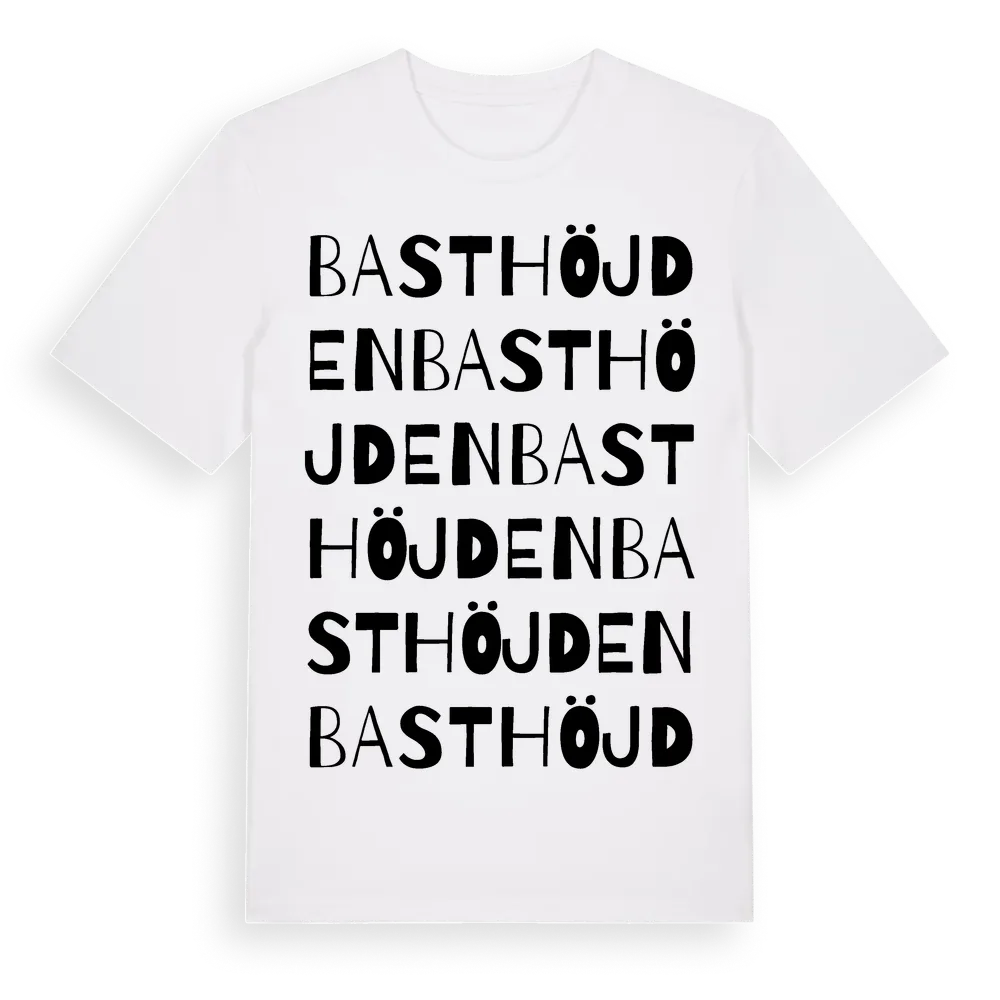 Basthöjden ordlek t-shirt är inspirerad av Basthöjden i Värmlands län, Sverige. Tröjan är designad för dig som har en speciell koppling till platsen – oavsett om du bor här, har rötterna här eller bara älskar Basthöjden.