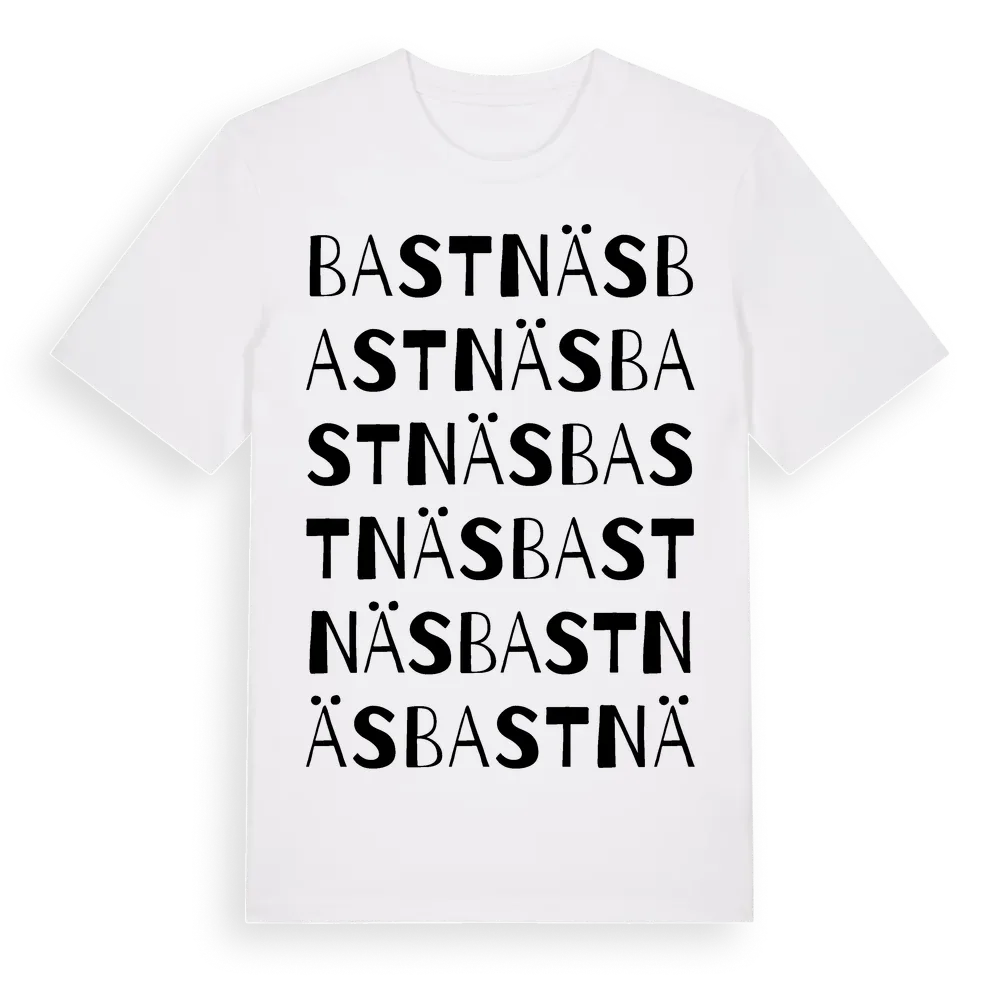 Bastnäs ordlek t-shirt är inspirerad av Bastnäs i Värmlands län, Sverige. Tröjan är designad för dig som har en speciell koppling till platsen – oavsett om du bor här, har rötterna här eller bara älskar Bastnäs.