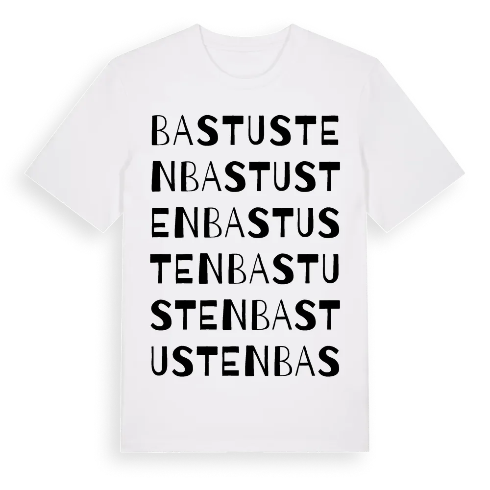 En ordlek byggd på Bastustens namn. Subtilt och klurig – ett motiv som bara de som verkligen känner platsen fullt ut förstår. Premium bomull, unisex – från Bastusten i Värmlands län.