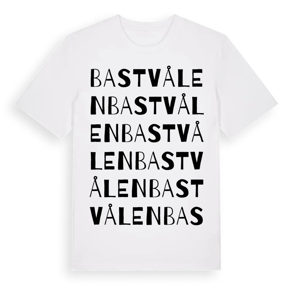 Bastvålen ordlek t-shirt är inspirerad av Bastvålen i Värmlands län, Sverige. Tröjan är designad för dig som har en speciell koppling till platsen – oavsett om du bor här, har rötterna här eller bara älskar Bastvålen.
