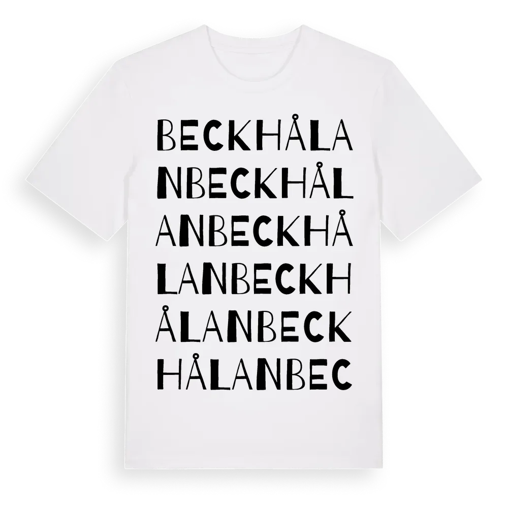 Beckhålan ordlek t-shirt är inspirerad av Beckhålan i Värmlands län, Sverige. Tröjan är designad för dig som har en speciell koppling till platsen – oavsett om du bor här, har rötterna här eller bara älskar Beckhålan.