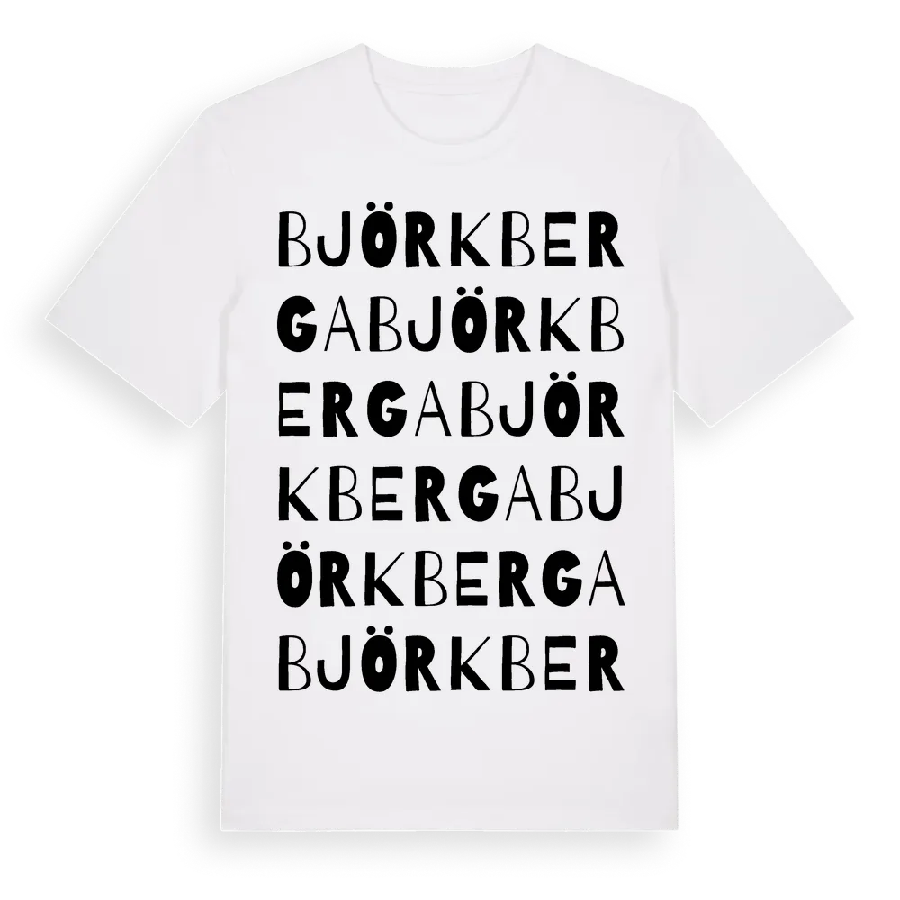 Björkberga ordlek t-shirt är inspirerad av Björkberga i Värmlands län, Sverige. Tröjan är designad för dig som har en speciell koppling till platsen – oavsett om du bor här, har rötterna här eller bara älskar Björkberga.