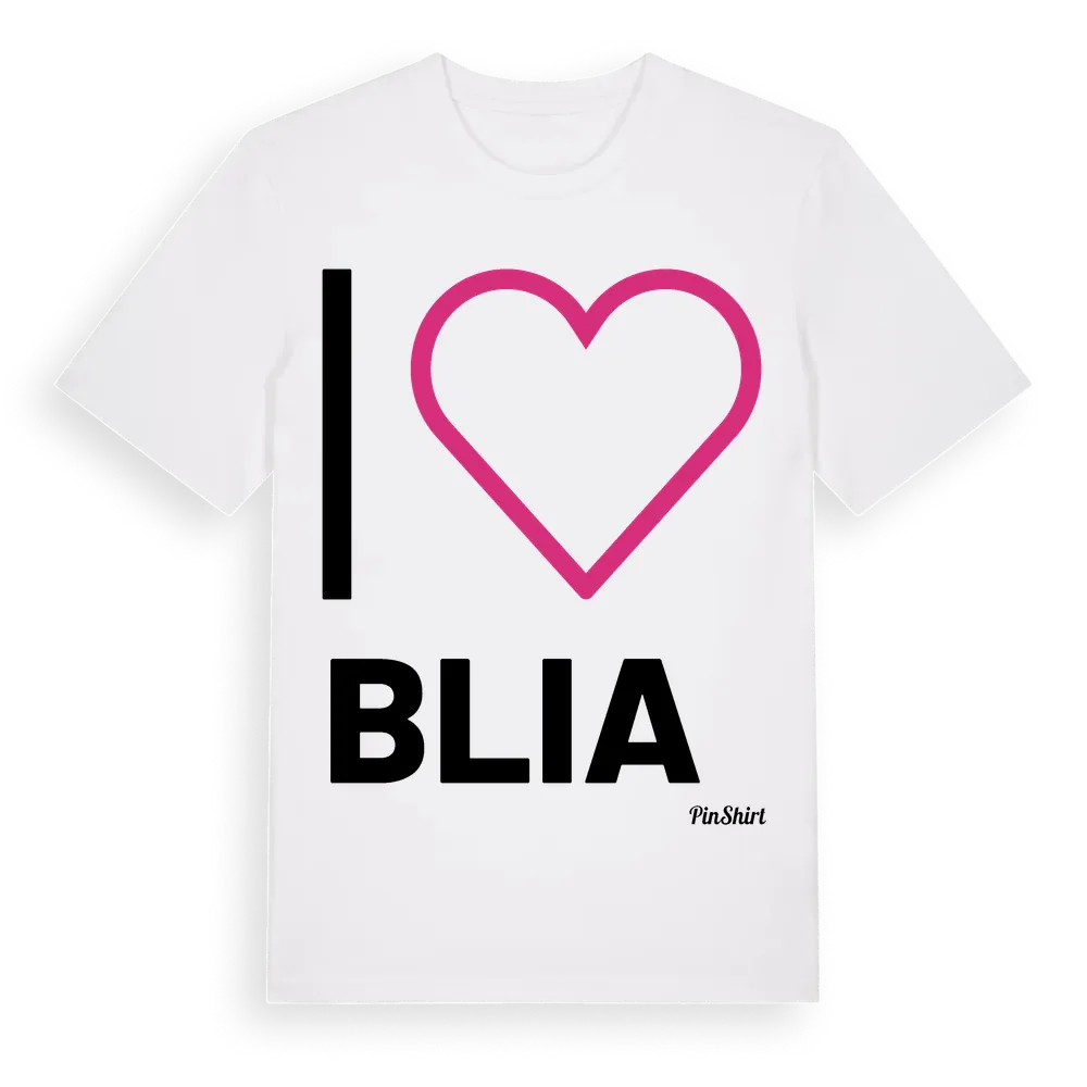 Det klassiska "I ❤ Blia"-motivet i stort format som täcker hela bröstet. För dig som vill visa kärleken till Blia på riktigt. Premium bomull, unisex – från byn Blia i Värmlands län.