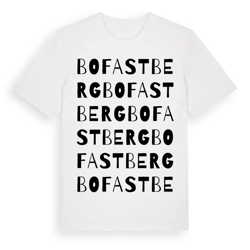 Bofastberg ordlek t-shirt är inspirerad av Bofastberg i Värmlands län, Sverige. Tröjan är designad för dig som har en speciell koppling till platsen – oavsett om du bor här, har rötterna här eller bara älskar Bofastberg.