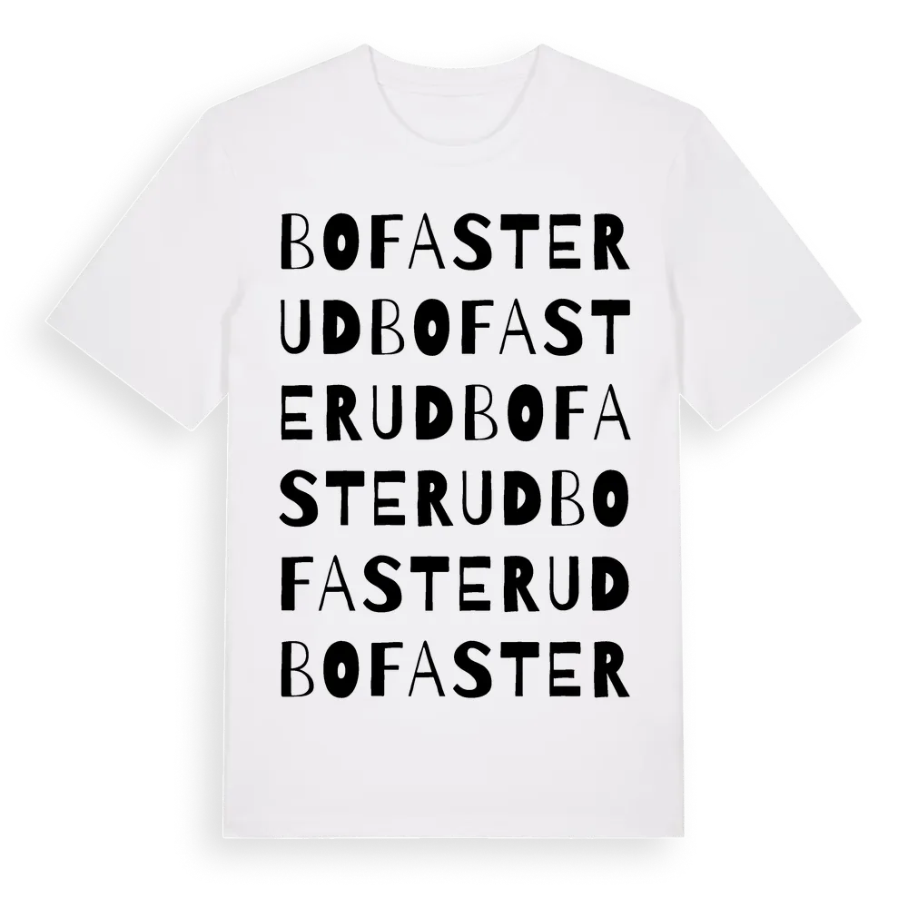 Bofasterud ordlek t-shirt är inspirerad av byn Bofasterud i Värmlands län, Sverige. Tröjan är designad för dig som har en speciell koppling till platsen – oavsett om du bor här, har rötterna här eller bara älskar Bofasterud.