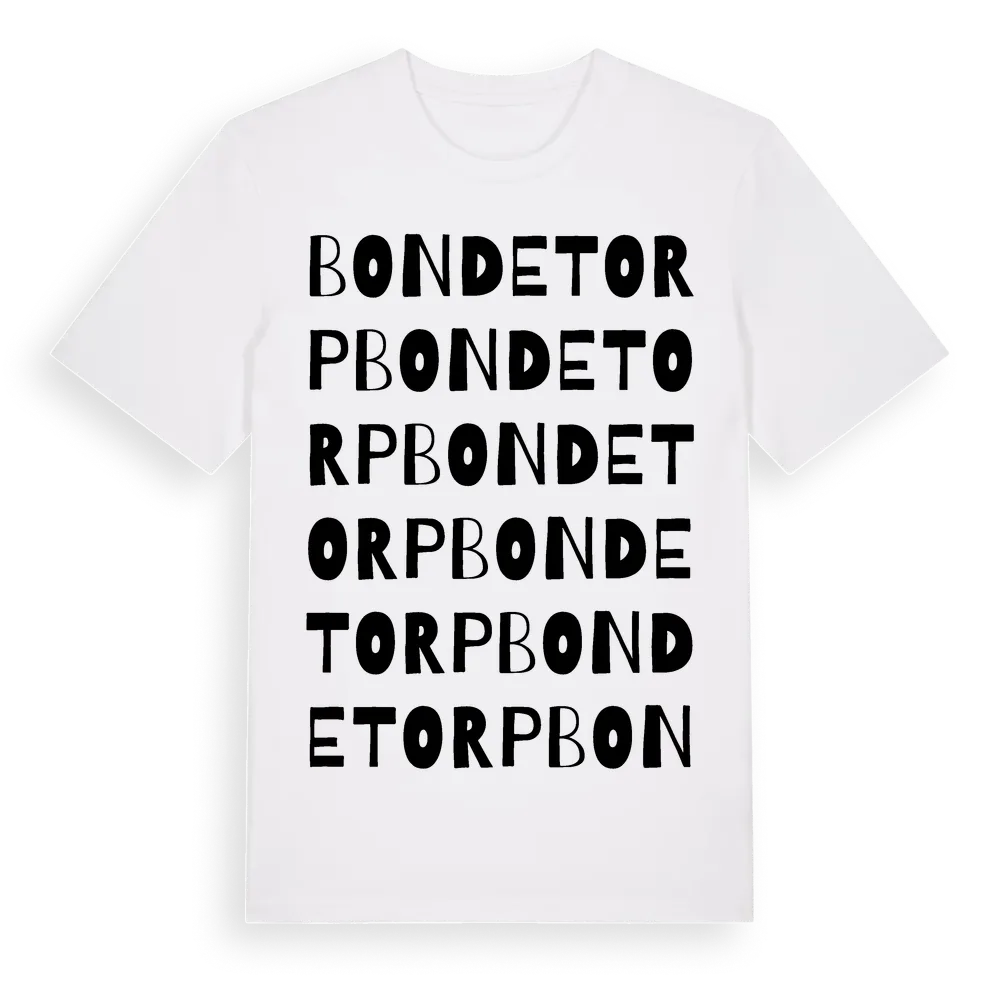 Bondetorp ordlek t-shirt är inspirerad av Bondetorp i Värmlands län, Sverige. Tröjan är designad för dig som har en speciell koppling till platsen – oavsett om du bor här, har rötterna här eller bara älskar Bondetorp.