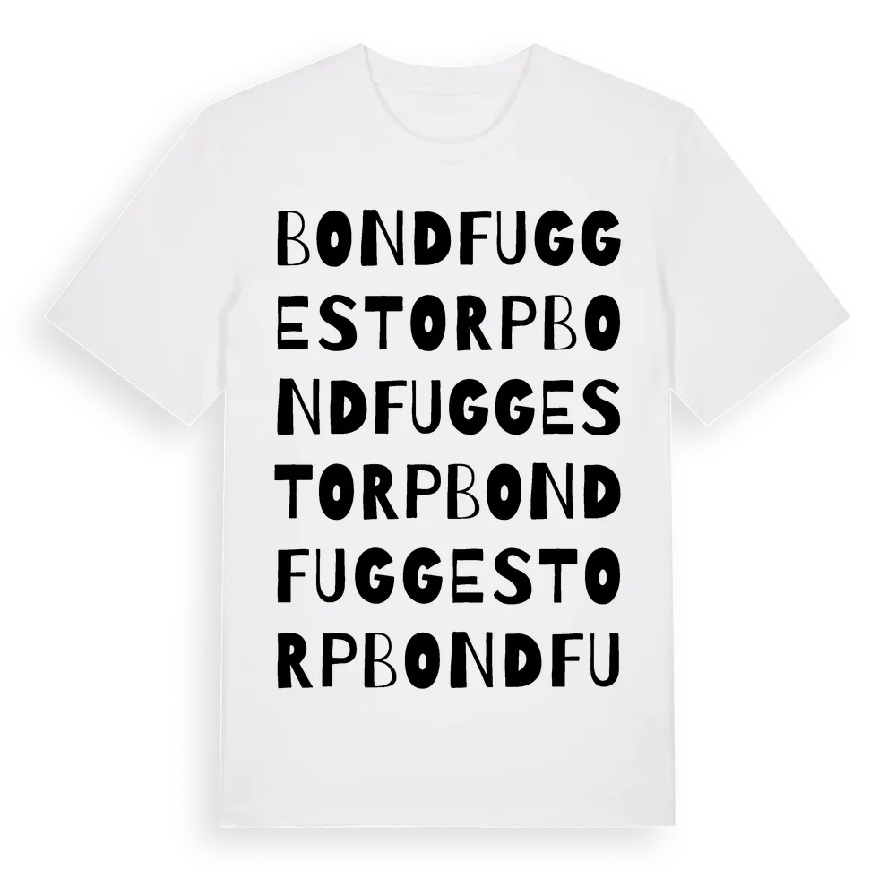 Bondfuggestorp ordlek t-shirt är inspirerad av Bondfuggestorp i Värmlands län, Sverige. Tröjan är designad för dig som har en speciell koppling till platsen – oavsett om du bor här, har rötterna här eller bara älskar Bondfuggestorp.