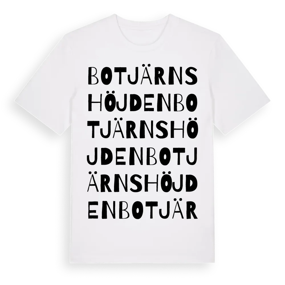 Botjärnshöjden ordlek t-shirt är inspirerad av Botjärnshöjden i Värmlands län, Sverige. Tröjan är designad för dig som har en speciell koppling till platsen – oavsett om du bor här, har rötterna här eller bara älskar Botjärnshöjden.