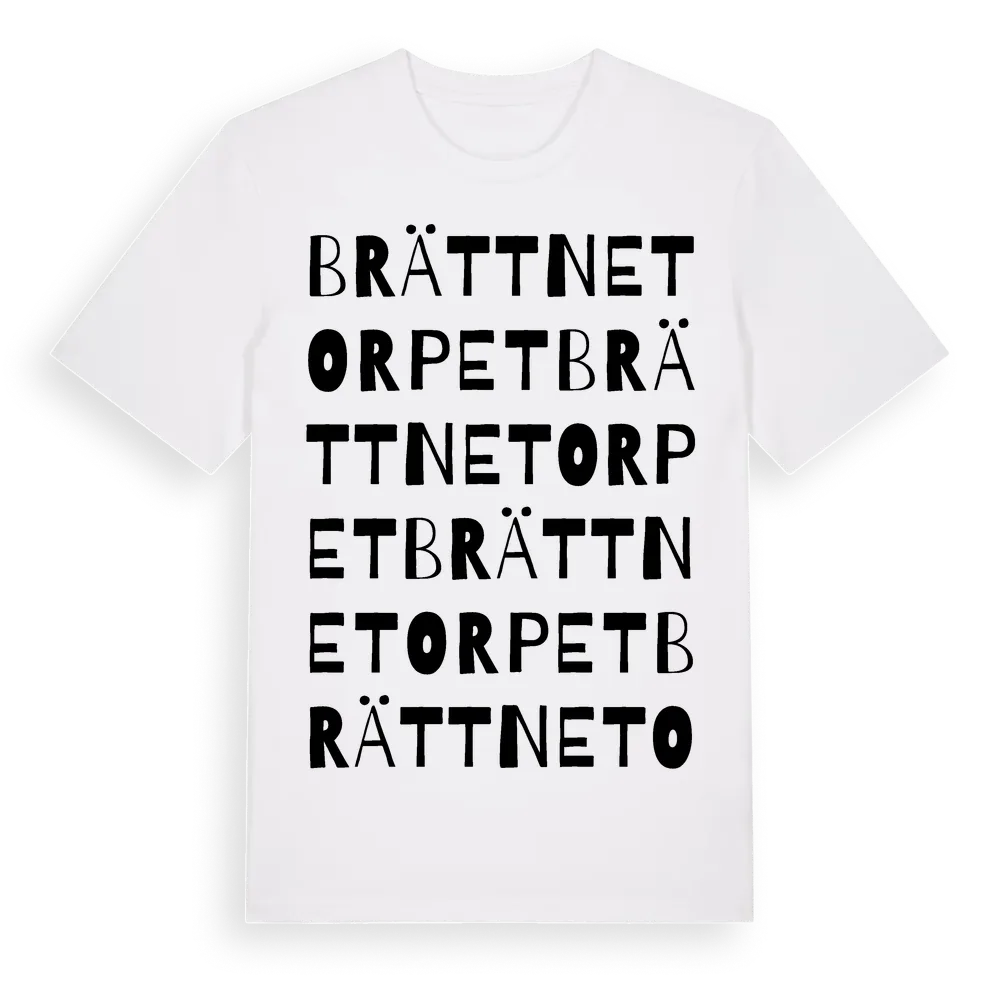 Brättnetorpet ordlek t-shirt är inspirerad av Brättnetorpet i Värmlands län, Sverige. Tröjan är designad för dig som har en speciell koppling till platsen – oavsett om du bor här, har rötterna här eller bara älskar Brättnetorpet.