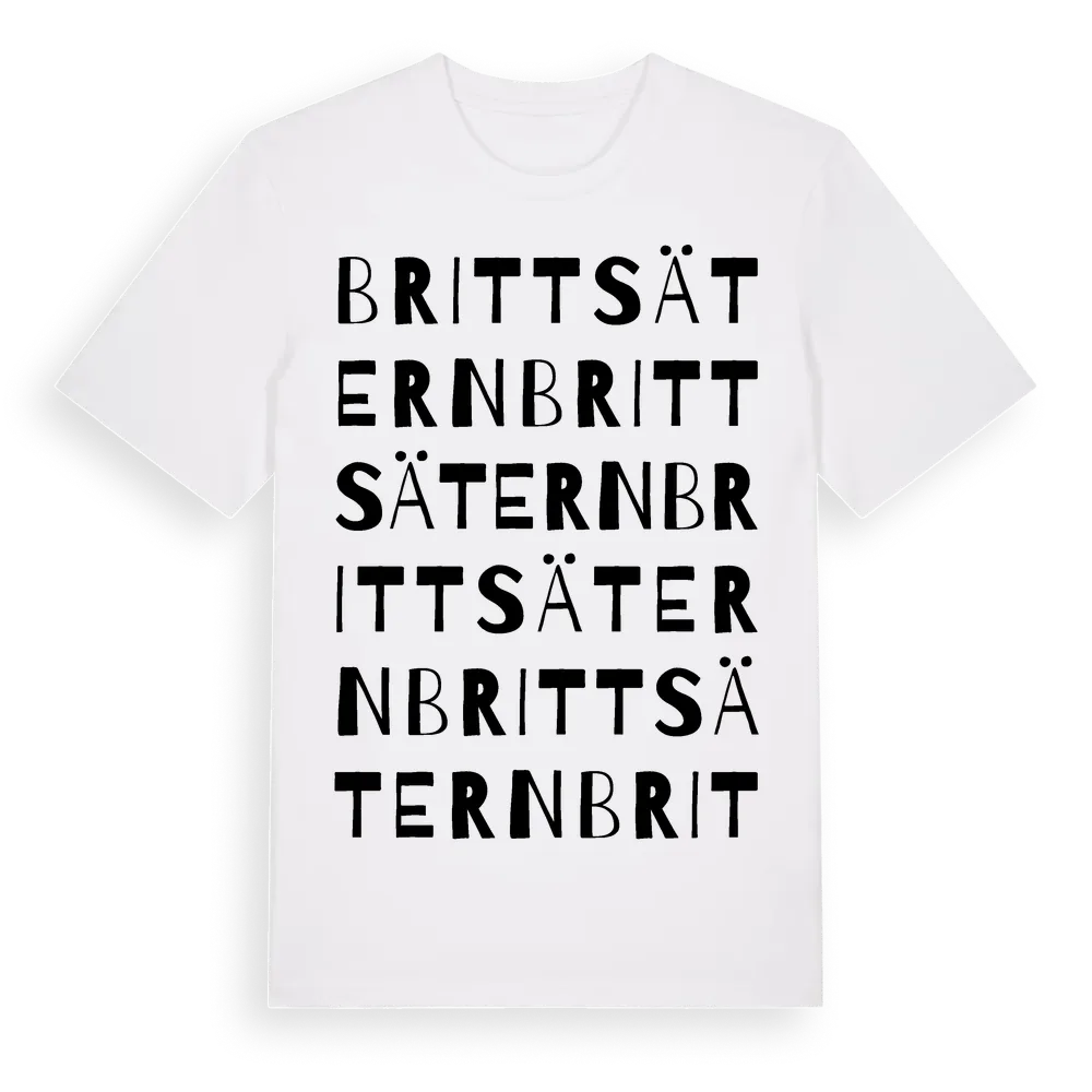 Brittsätern ordlek t-shirt är inspirerad av Brittsätern i Värmlands län, Sverige. Tröjan är designad för dig som har en speciell koppling till platsen – oavsett om du bor här, har rötterna här eller bara älskar Brittsätern.