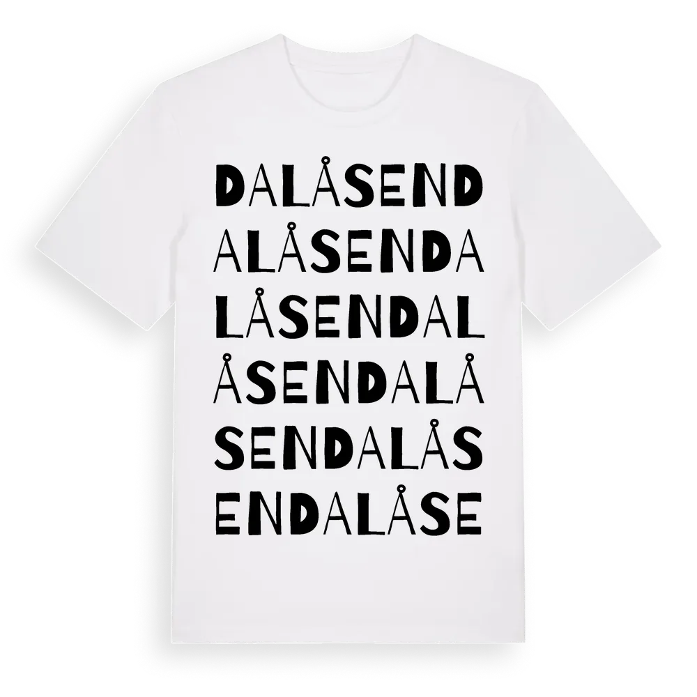 Dalåsen ordlek t-shirt är inspirerad av Dalåsen i Värmlands län, Sverige. Tröjan är designad för dig som har en speciell koppling till platsen – oavsett om du bor här, har rötterna här eller bara älskar Dalåsen.