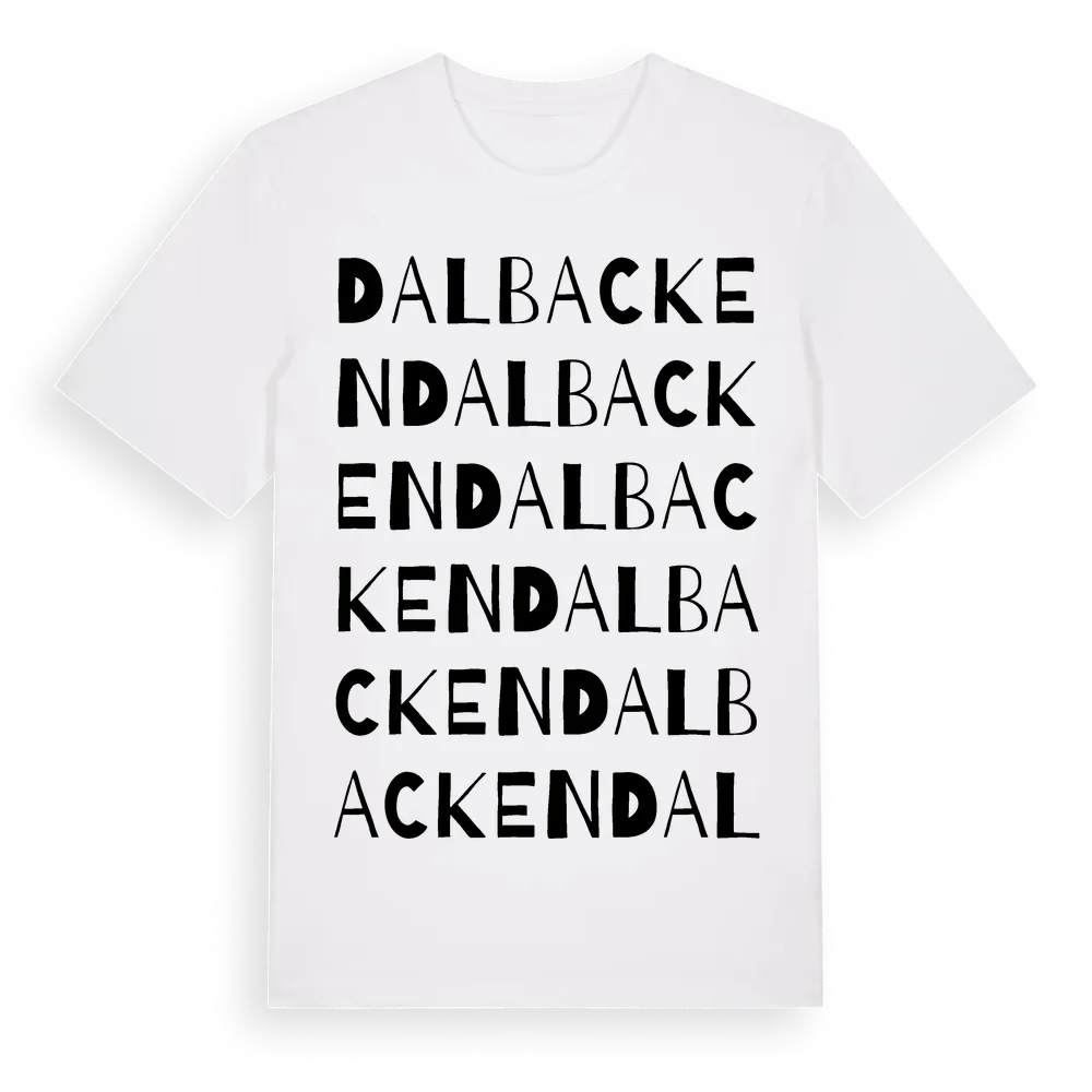 Dalbacken ordlek t-shirt är inspirerad av Dalbacken i Värmlands län, Sverige. Tröjan är designad för dig som har en speciell koppling till platsen – oavsett om du bor här, har rötterna här eller bara älskar Dalbacken.