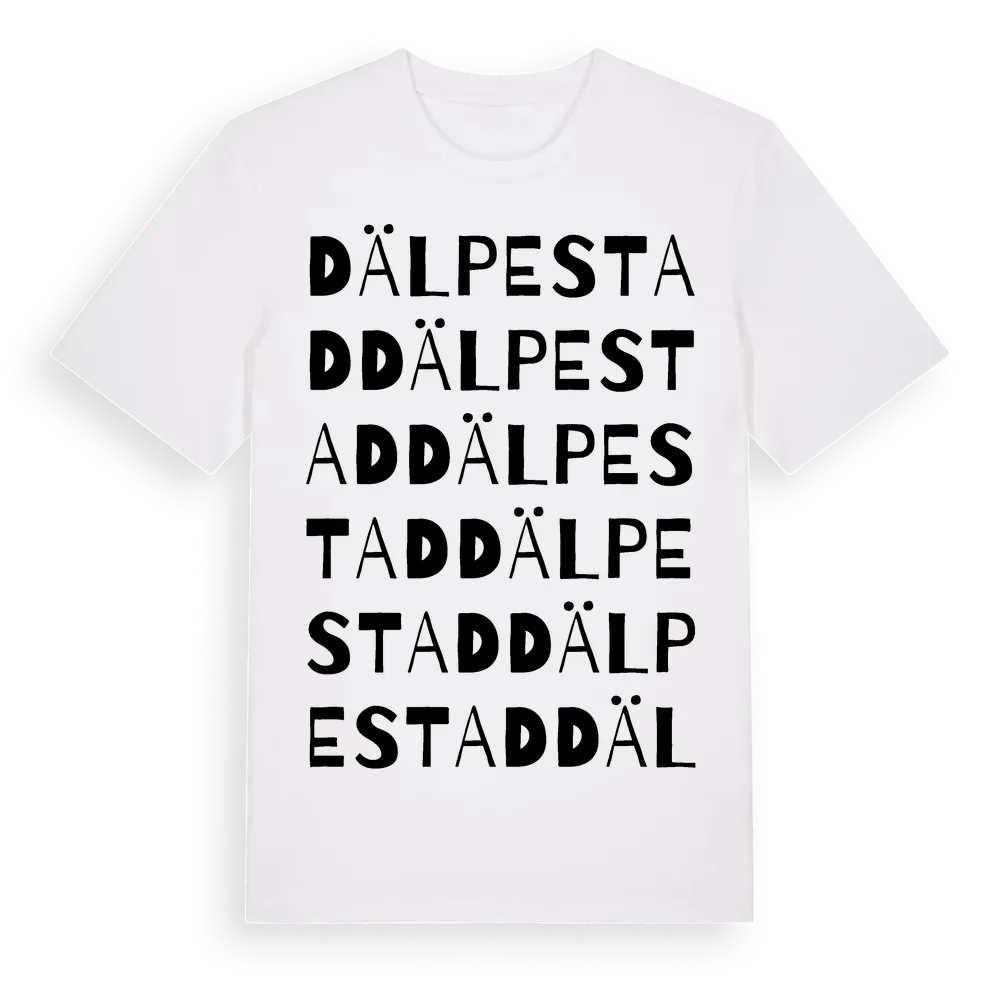 Dälpestad ordlek t-shirt är inspirerad av Dälpestad i Värmlands län, Sverige. Tröjan är designad för dig som har en speciell koppling till platsen – oavsett om du bor här, har rötterna här eller bara älskar Dälpestad.