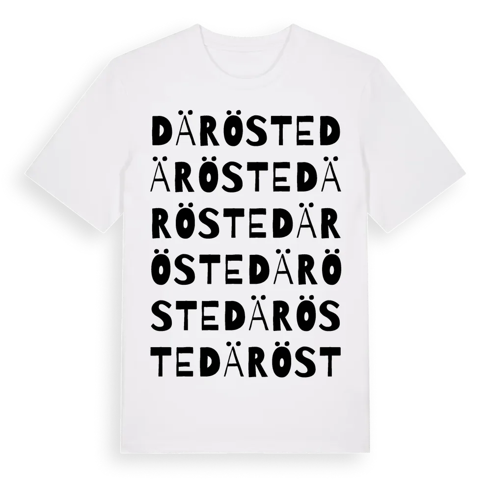 Däröste ordlek t-shirt är inspirerad av Däröste i Värmlands län, Sverige. Tröjan är designad för dig som har en speciell koppling till platsen – oavsett om du bor här, har rötterna här eller bara älskar Däröste.