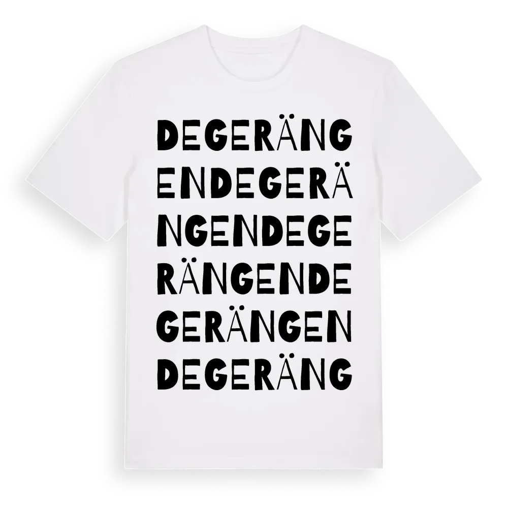 En ordlek byggd på Degerängens namn. Subtilt och klurig – ett motiv som bara de som verkligen känner platsen fullt ut förstår. Premium bomull, unisex – från stadsdelen Degerängen i Värmlands län.