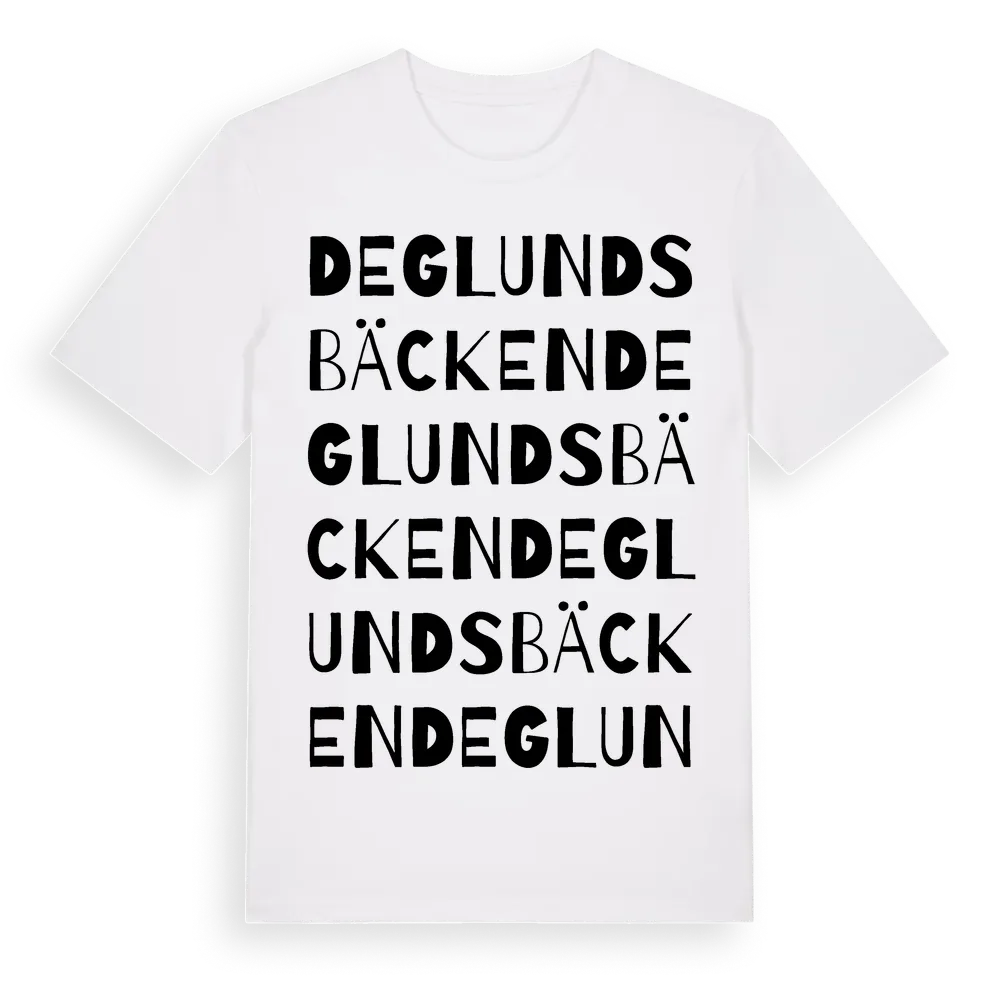Deglundsbäcken ordlek t-shirt är inspirerad av Deglundsbäcken i Värmlands län, Sverige. Tröjan är designad för dig som har en speciell koppling till platsen – oavsett om du bor här, har rötterna här eller bara älskar Deglundsbäcken.