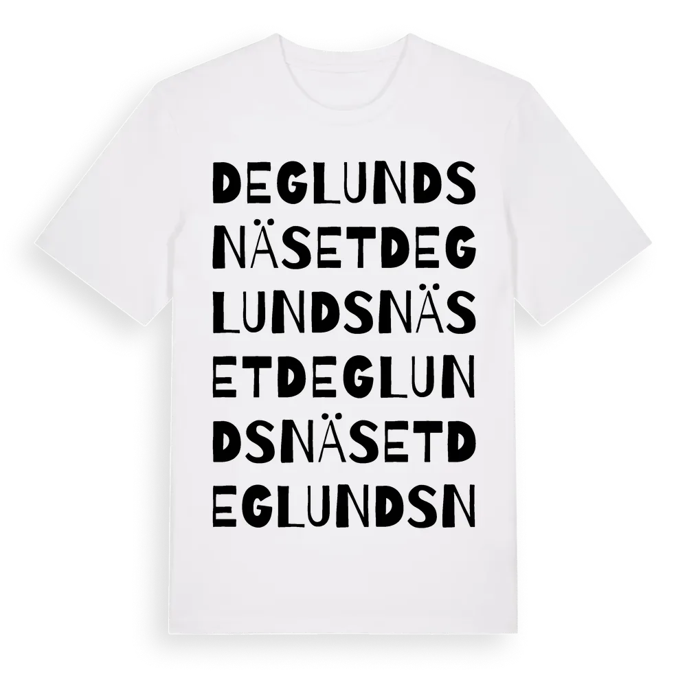 Deglundsnäset ordlek t-shirt är inspirerad av Deglundsnäset i Värmlands län, Sverige. Tröjan är designad för dig som har en speciell koppling till platsen – oavsett om du bor här, har rötterna här eller bara älskar Deglundsnäset.