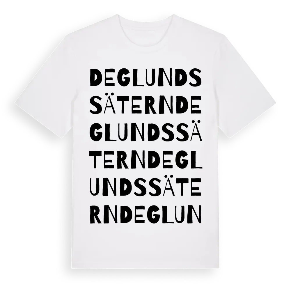 Deglundssätern ordlek t-shirt är inspirerad av Deglundssätern i Värmlands län, Sverige. Tröjan är designad för dig som har en speciell koppling till platsen – oavsett om du bor här, har rötterna här eller bara älskar Deglundssätern.