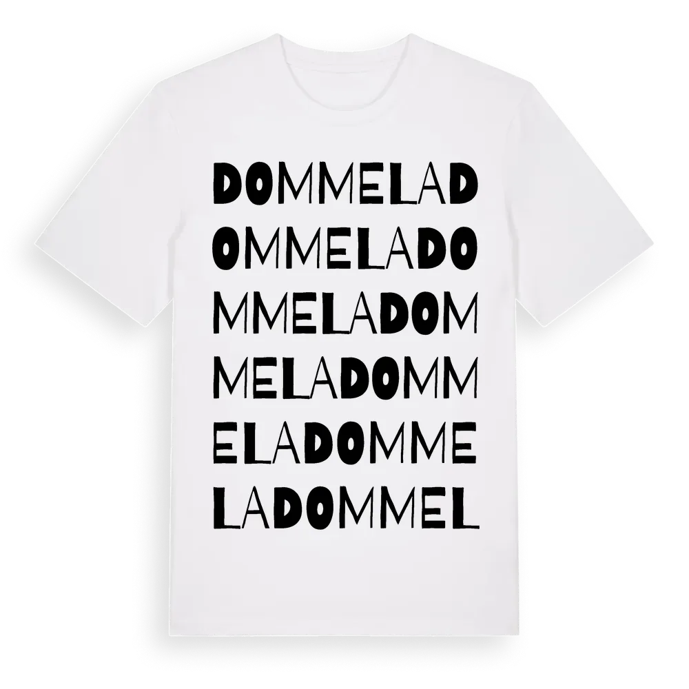 Dommela ordlek t-shirt är inspirerad av Dommela i Värmlands län, Sverige. Tröjan är designad för dig som har en speciell koppling till platsen – oavsett om du bor här, har rötterna här eller bara älskar Dommela.