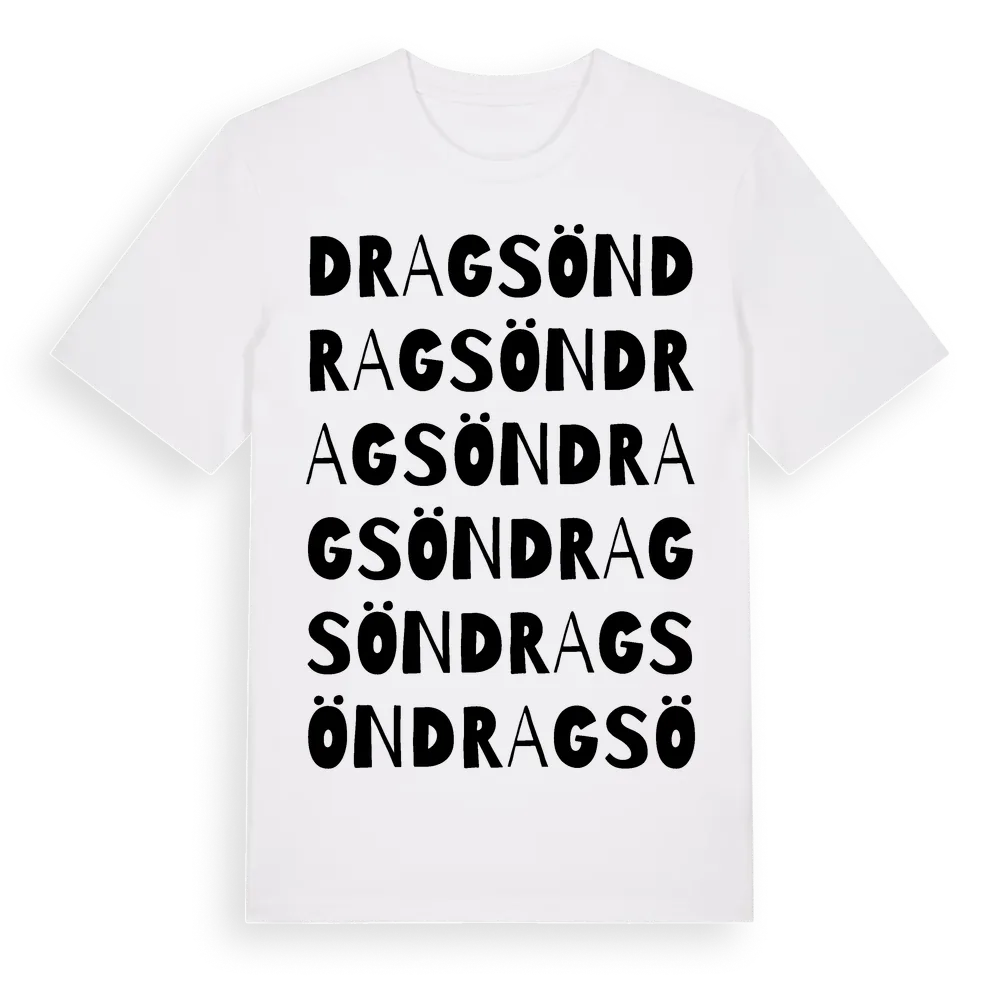 Dragsön ordlek t-shirt är inspirerad av ön Dragsön i Värmlands län, Sverige. Tröjan är designad för dig som har en speciell koppling till platsen – oavsett om du bor här, har rötterna här eller bara älskar Dragsön.