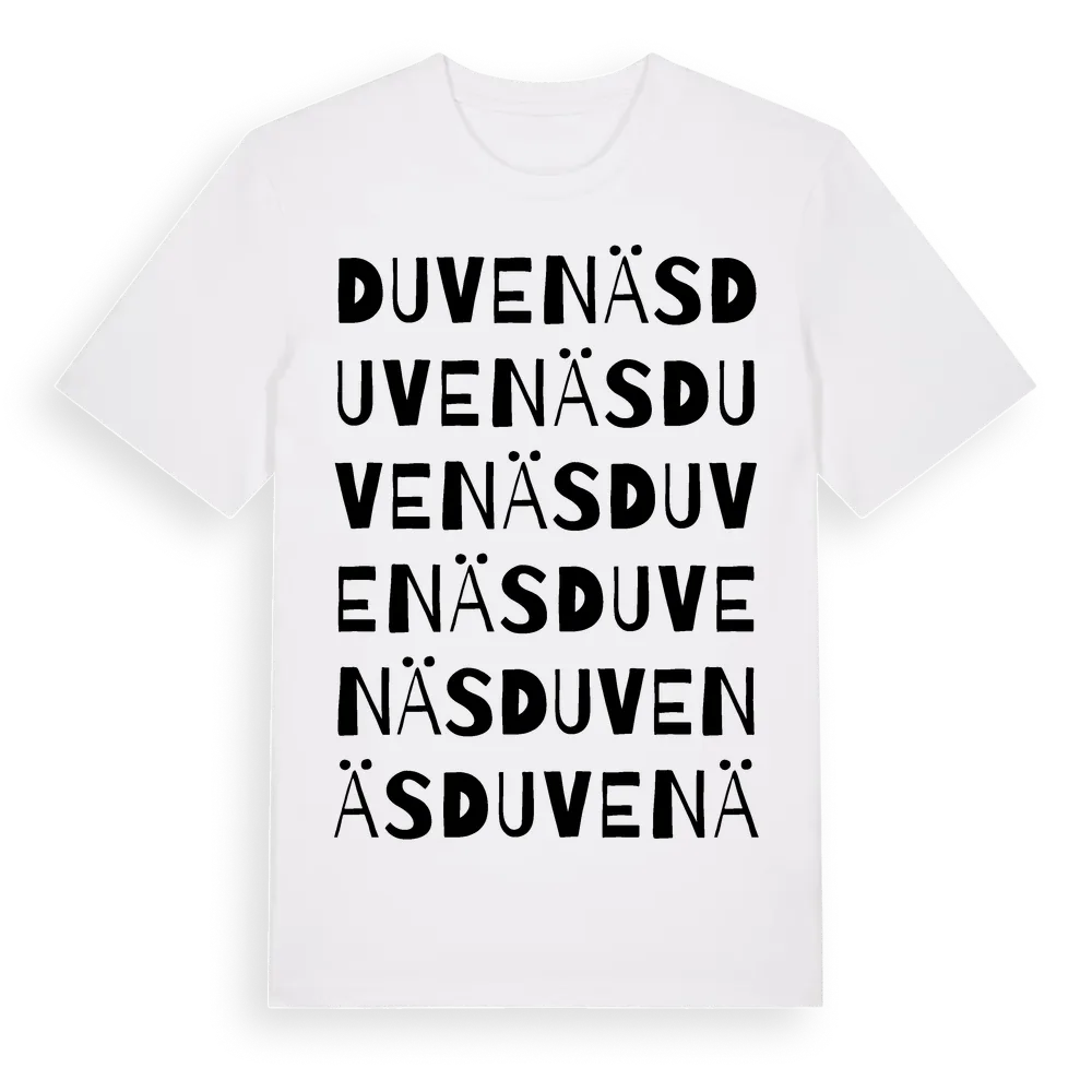 Duvenäs ordlek t-shirt är inspirerad av byn Duvenäs i Värmlands län, Sverige. Tröjan är designad för dig som har en speciell koppling till platsen – oavsett om du bor här, har rötterna här eller bara älskar Duvenäs.