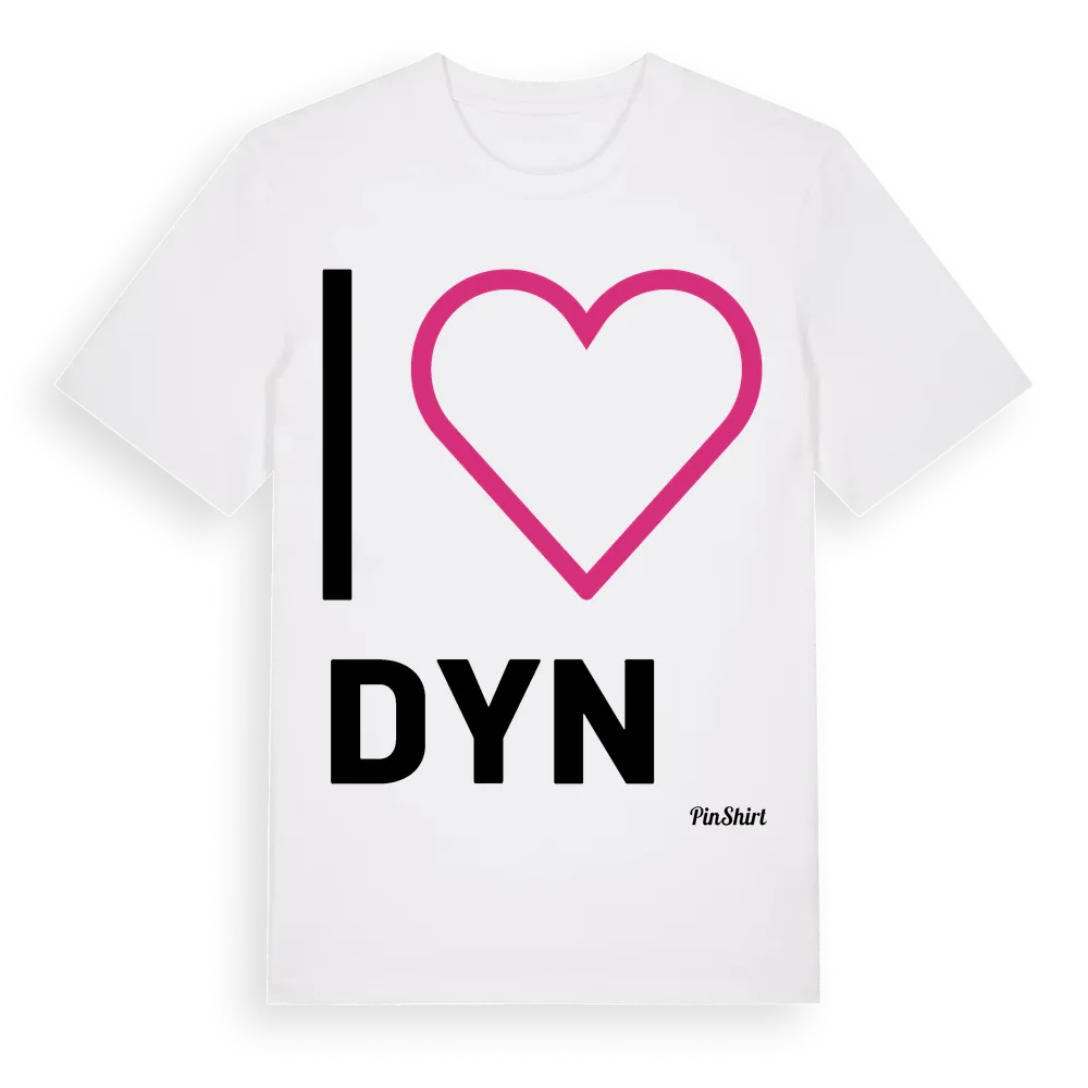 Det klassiska "I ❤ Dyn"-motivet i stort format som täcker hela bröstet. För dig som vill visa kärleken till Dyn på riktigt. Premium bomull, unisex – från Dyn i Värmlands län.