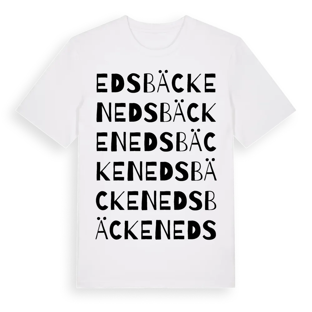 Edsbäcken ordlek t-shirt är inspirerad av Edsbäcken i Värmlands län, Sverige. Tröjan är designad för dig som har en speciell koppling till platsen – oavsett om du bor här, har rötterna här eller bara älskar Edsbäcken.