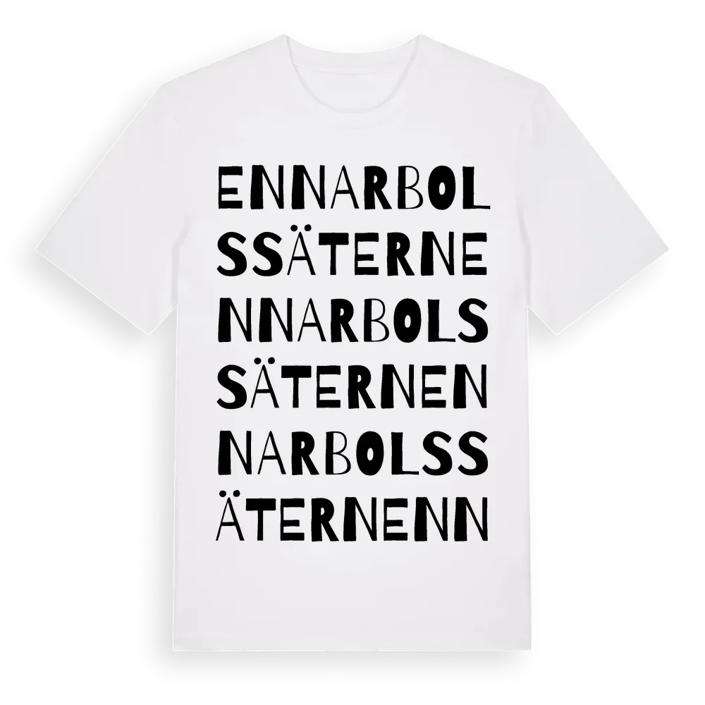 Ennarbolssätern ordlek t-shirt är inspirerad av byn Ennarbolssätern i Värmlands län, Sverige. Tröjan är designad för dig som har en speciell koppling till platsen – oavsett om du bor här, har rötterna här eller bara älskar Ennarbolssätern.