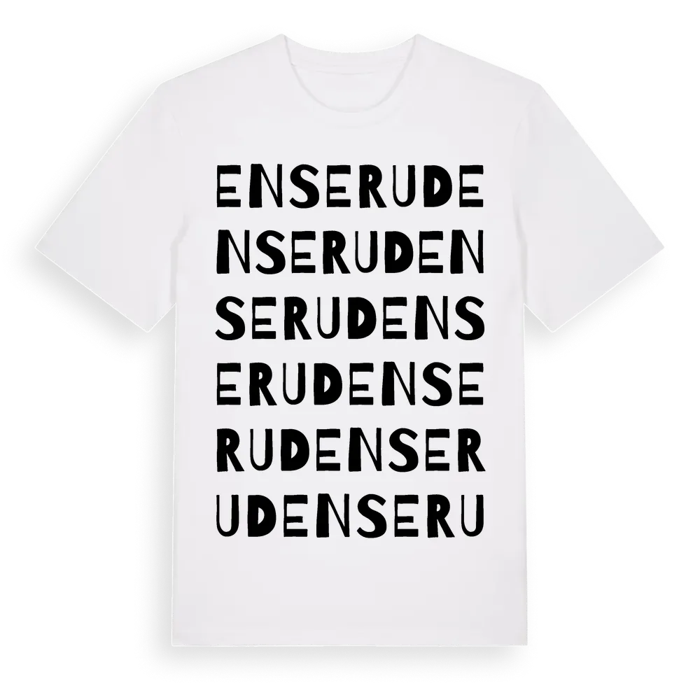 Enserud ordlek t-shirt är inspirerad av stadsdelen Enserud i Värmlands län, Sverige. Tröjan är designad för dig som har en speciell koppling till platsen – oavsett om du bor här, har rötterna här eller bara älskar Enserud.