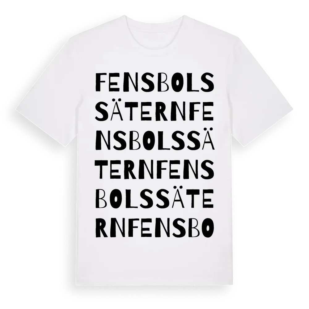 Fensbolssätern ordlek t-shirt är inspirerad av Fensbolssätern i Värmlands län, Sverige. Tröjan är designad för dig som har en speciell koppling till platsen – oavsett om du bor här, har rötterna här eller bara älskar Fensbolssätern.