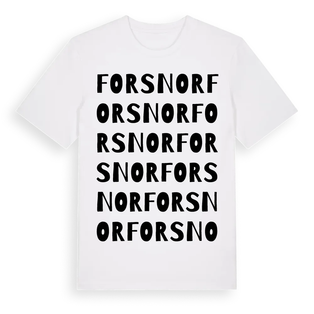 Forsnor ordlek t-shirt är inspirerad av byn Forsnor i Värmlands län, Sverige. Tröjan är designad för dig som har en speciell koppling till platsen – oavsett om du bor här, har rötterna här eller bara älskar Forsnor.