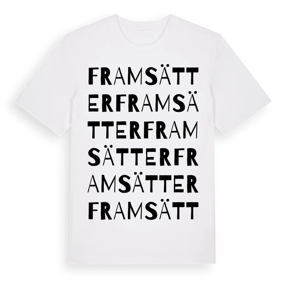 Framsätter ordlek t-shirt är inspirerad av Framsätter i Värmlands län, Sverige. Tröjan är designad för dig som har en speciell koppling till platsen – oavsett om du bor här, har rötterna här eller bara älskar Framsätter.