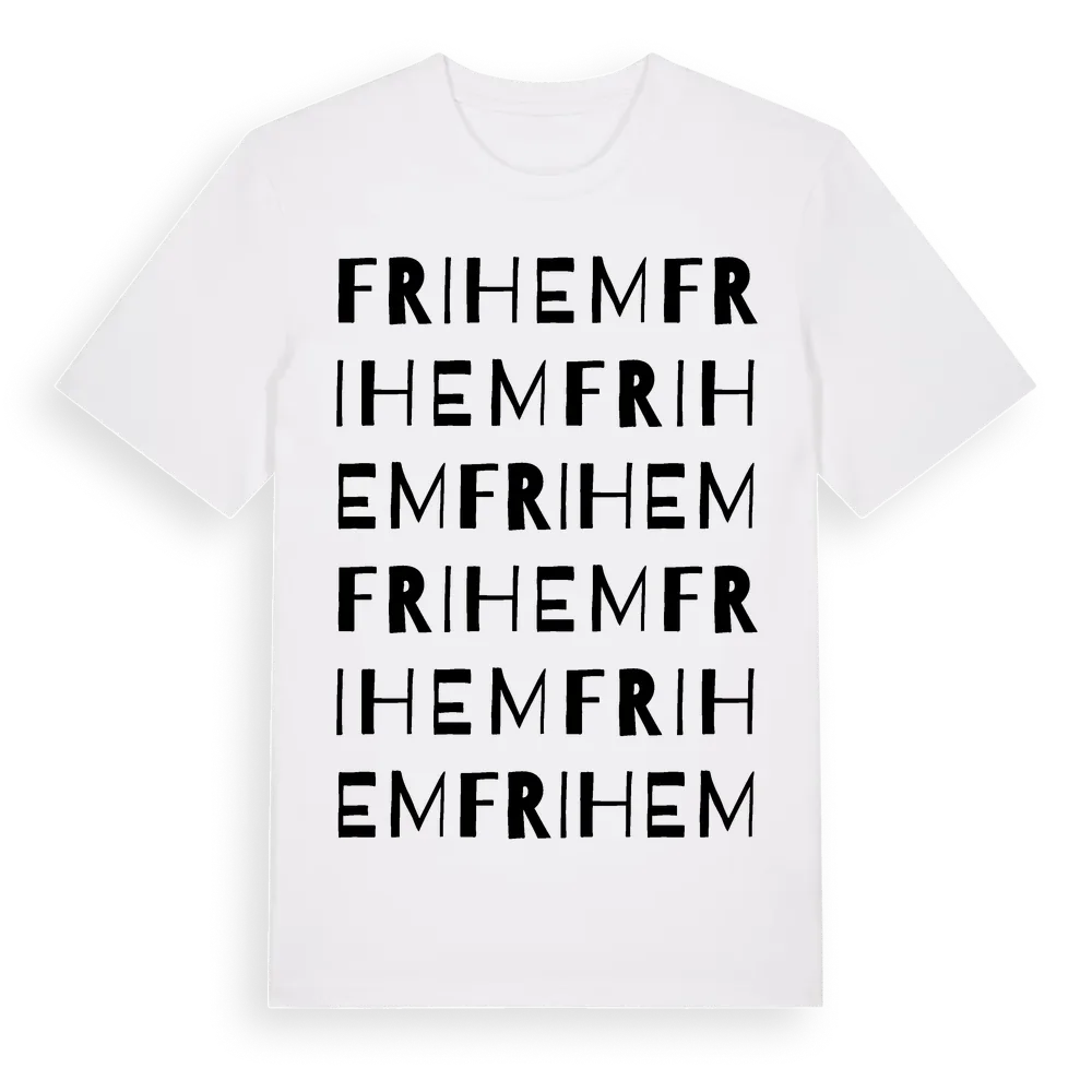 Frihem ordlek t-shirt är inspirerad av Frihem i Värmlands län, Sverige. Tröjan är designad för dig som har en speciell koppling till platsen – oavsett om du bor här, har rötterna här eller bara älskar Frihem.