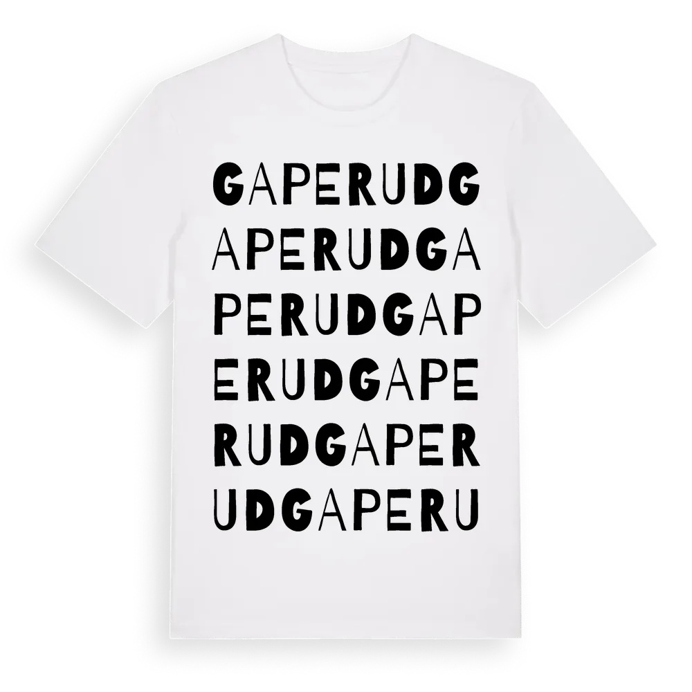 Gaperud ordlek t-shirt är inspirerad av byn Gaperud i Värmlands län, Sverige. Tröjan är designad för dig som har en speciell koppling till platsen – oavsett om du bor här, har rötterna här eller bara älskar Gaperud.